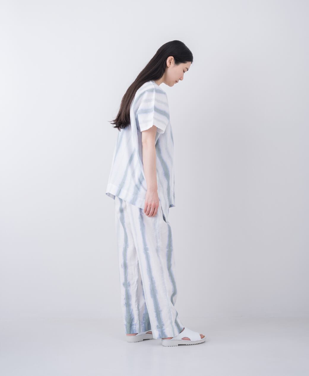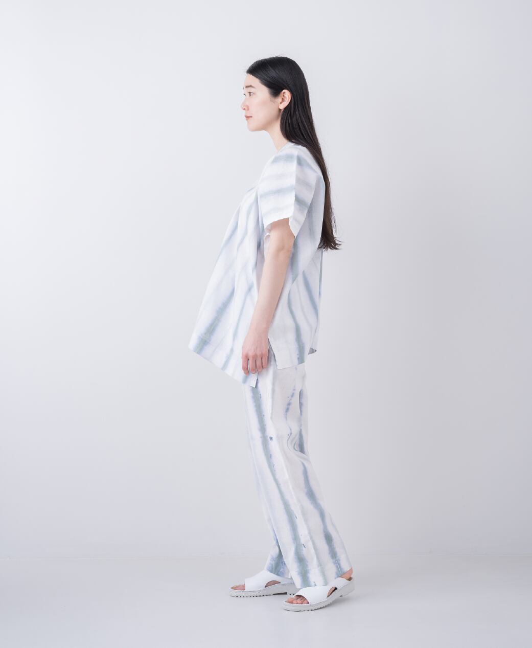 縦縞模様は2色のBLUE GRAYで板締めしたカットソー。