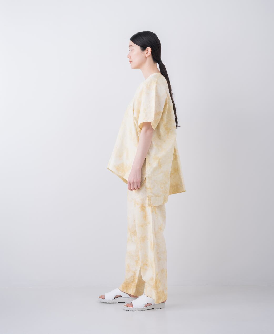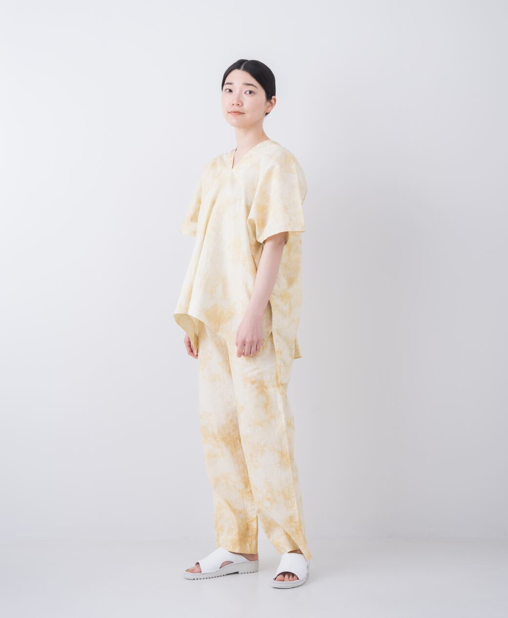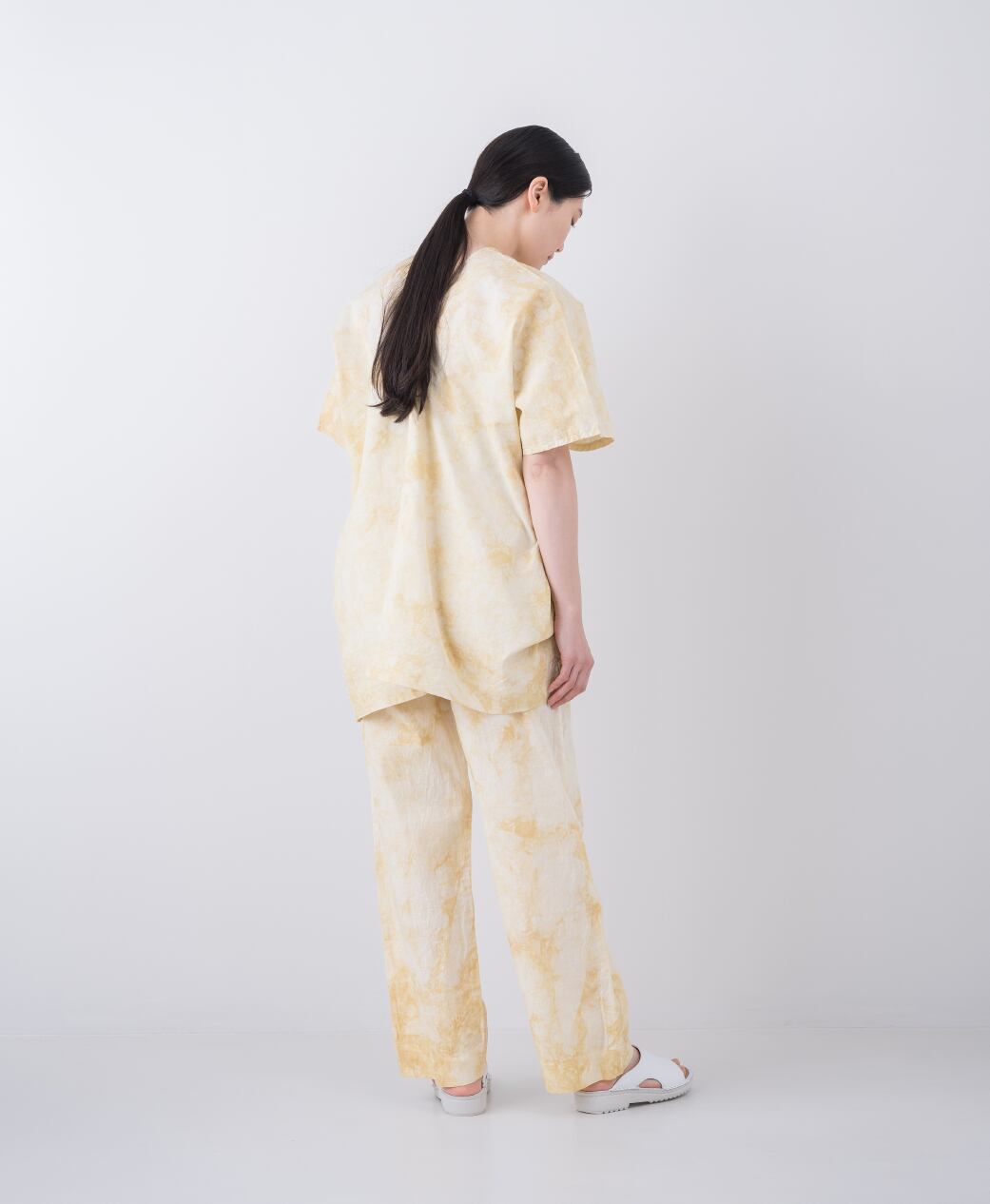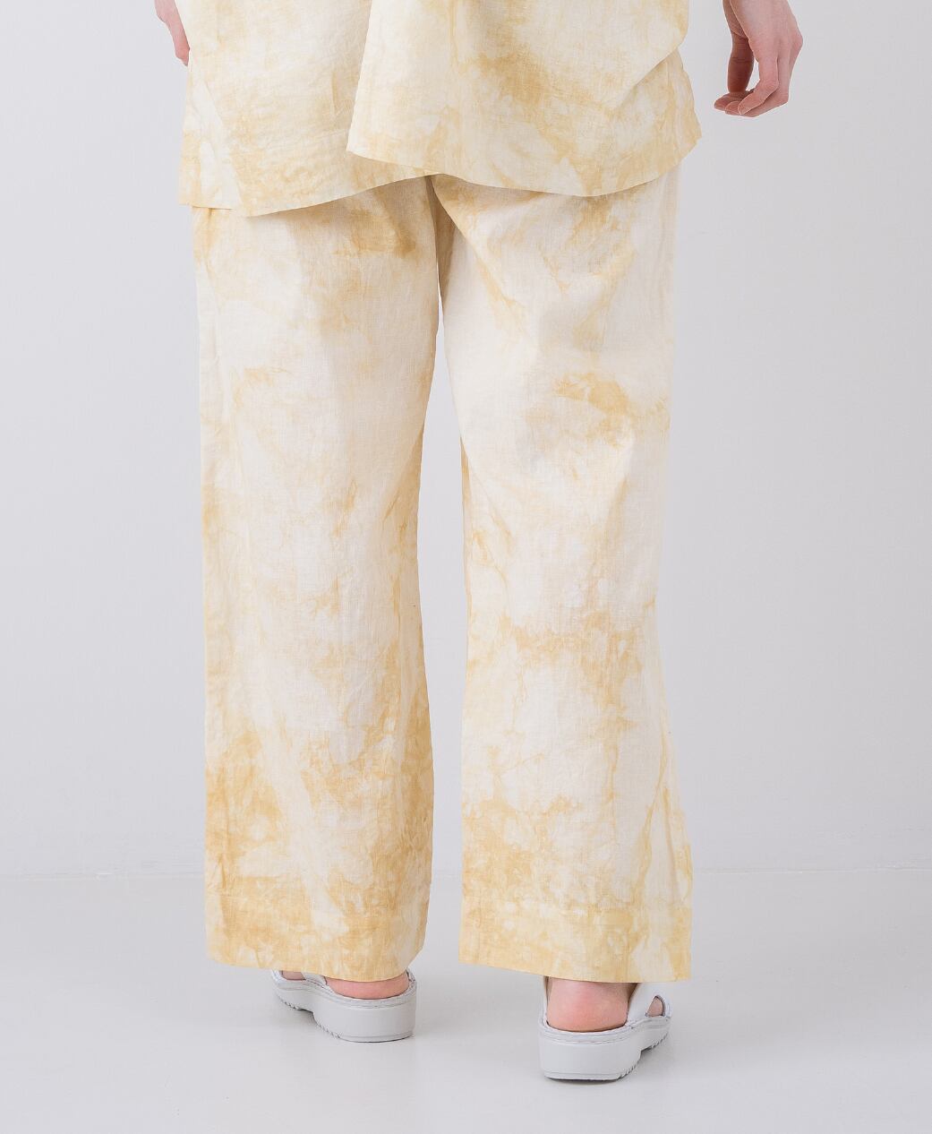 渋めのミモザ色の濃淡で籠染したストレートパンツ。
